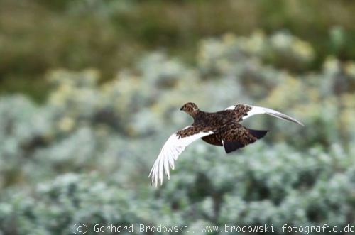 Durch den ständigen Gefiederwechsel ist das Alpenschneehuhn immer zu jeder Jahreszeit perfekt getarnt. Zur Bestimmung vom Gefieder zeige ich Euch noch einige Bilder. Wie sieht das Alpenschneehuhn aus? Wann brüten Alpenschneehühner? Das Weibchen hat im Sommerkleid, während der Brutzeit im Mai bis Juli, ein gelbbraun marmoriertes Gefieder mit weißen Flügeln, einem kurzen kräftigen dunklen Schnabel, ein dunkles Auge und die Beine sind bis zu den Zehen mit weißen Federn befiedert, wie bei allen Raufußhühnern (z.B. Moorschneehuhn) besetzt.