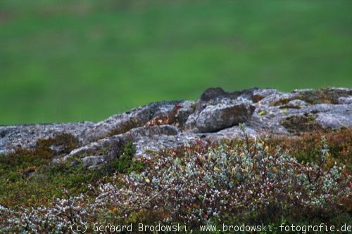 Im Brutgebiet der Alpenschneehühner sieht man auch den Polarfuchs, den Goldregenpfeifer, die Uferschnepfe, die Raubmöwen und den Gerfalken. In Norwegen kann man auch gut die Alpenschneehühner beobachten.