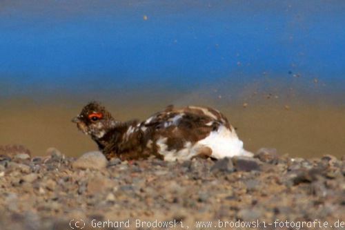 Da wir unsere Beobachtungen im Revier der Schneehühner vom Auto aus gemacht haben, gehörten wir nicht zu ihrem Feindbild. Traten aber Störungen vom Polarfuchs, von Groß-Möwen, von Raubmöwen oder von Menschen auf, wurde sofort von irgendeinem Vogel im Revier Alarm ausgelöst. Und einen Augenblick später waren alle in der Luft und kreisten um den Eindringling. Es stand abwechselnd immer ein Vogel auf einer Anhöhe, entweder ein Goldregenpfeifer, ein Rotschenkel, ein Brachvogel oder eine Uferschnepfe und passte auf, dass kein Feind unbemerkt ins Revier eindringen konnte. Da kann man sehen, dass auch verschiedene Vögel die zusammen im Revier brüten, gemeinsam auf ihre Feinde achten und alle sich gegenseitig unterstützen. Es war immer ein Schauspiel wenn Bekassinen, Uferschnepfen, Regenbrachvögel und Rotschenkel gemeinsam in der Luft waren.
