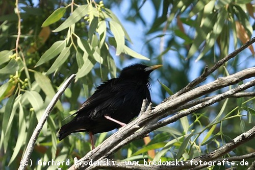 Wie sieht der Einfarbstar aus? Männchen und Weibchen vom Einfarbstar sehen im Prachtkleid gleich aus. Das Gefieder ist einheitlich glänzend schwarz, der Schnabel ist gelb und die Beine sind rosarot. Wir konnten keinen wesentlichen Unterschied zwischen Männchen und Weibchen feststellen. Die Weibchen sind etwas größer und schwerer, was aber nicht auffällt. Zum Bestimmen der Vogelart zeige ich euch auch ein Flugbild.