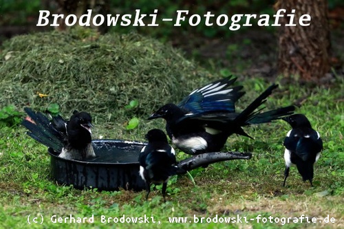 Nach ca 28 Tagen verlassen die Jungvögel ihr Nest. Die Jungen werden noch eine Zeit lang von beiden Eltern mit Nahrung versorgt, bis sich die Jungen mit anderen jungen Elstern zusammenschließen. Junge Elstern im Jugendkleid erkennt man an ihren kurzen Schwanzfedern. Dazu zeige ich Euch ein Foto.