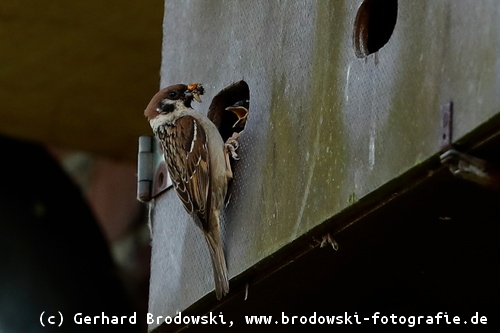 Besonderheit: Feldsperlinge haben kein Problem, wenn das Einflugloch nicht vorne oder an der Seite ist, sonder z.B. von unten.