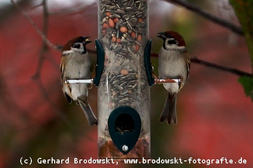Die Feldsperlinge passen sich immer mehr den Menschen an. Man sieht sie immer mehr in Städten an Futterstellen und an den Vogeltränken. Anscheinend haben sie auch erkannt, dass die Felder und Wiesen durch Pestizide verseucht sind, und es sich in Städten gesünder leben lässt.