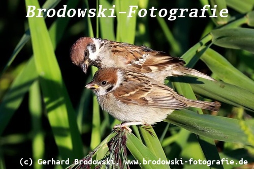 Ein besonderes Verhalten von den Feldsperlingen ist es, dass einige Männchen zwei Weibchen haben und mit beiden gleichzeitig Junge aufziehen. Dabei kommt das Männchen ganz schön ins schwitzen. Ich konnte beobachten, wie Feldspatzen in den Rohren von Überlandleitungen brüteten. Auf der einen Seite im Rohr brüteten Feldsperlinge und auch auf der anderen Seite. Nach längerer Beobachtung stellte ich fest, dass für beide Brutplätze nur ein Männchen zuständig war. Das Männchen sauste häufig von der einen Seite der Überlandleitung zur anderen, um das Weibchen beim Brüten abzulösen. Erst schlüpften die Jungen auf der einen Seite und zwei Tage später auf der anderen Seite. Dazu ein paar Bilder