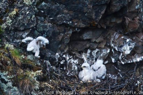 Das Wetter wurde immer schlechter, der Regen ließ nicht nach und so beschlossen wir die Beobachtung abzubrechen und zu einem späteren Zeitpunkt das Aufwachsen der jungen Raufußbussarde weiter zu verfolgen. Zwischenzeitlich wollten wir Sperbereulen und Merline beobachten. Nach 14 Tagen kamen wir wieder bei den Bussarden vorbei. Was war in der Zwischenzeit geschehen? Es waren nur noch zwei Junge im Nest. Ein Männchen und ein Weibchen.