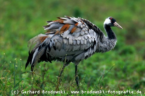 Nun zeige ich Euch ein paar Bilder zum Verhalten vom Kranich, wenn er krank ist, Stress mit Feinden oder Artgenossen hat oder sein Gefieder nach einem Regenschauer schnell trocknen will. Man muss aber genau beobachten, um was für ein Verhalten es sich handelt. Nicht dass man einen kranken Kranich sich selbst überlässt. Der Kranich der auf der Wiese liegt und sein Gefieder leicht anstellt, hatte einen Beinbruch der fast verheilt war. Nicht nur die Kraniche stellen ihr Gefieder bei Stress oder Krankheit auf, ich konnte es auch bei vielen anderen Vogelarten beobachten z.B. Greifvögel und Tauben.