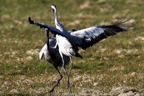 Wenn Kraniche im Frühjahr Richtung Norden ziehen und eine Zwischenstation einlegen, dann kann man sie häufig beim Hochzeitstanz beobachten.