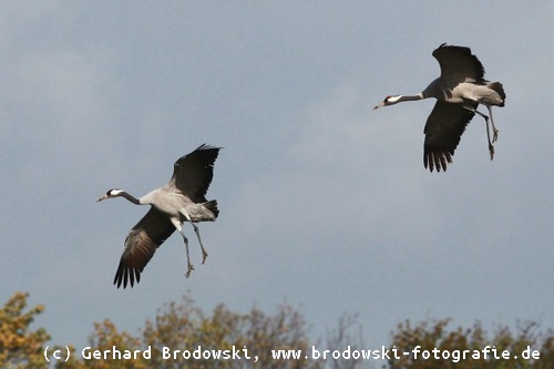 Die jungen Kraniche haben noch im Herbst ihr hellbraunes Gefieder und können schon wie die Alten durch die Luft gleiten.