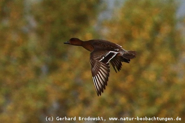 Nun noch ein paar Flugbilder zum Bestimmen und zum Erkennen von der Pfeifente, auf denen man gut die helle Unterseite und die Flügelfelder bei den Männchen sehen kann. Pfeifenten fliegen im Herbst und im Winter in großen Schwärmen z.B. mit Stockenten, Schnatterenten, Graugänsen, Spießenten und Blässgänsen zusammen. Auf den Flugbildern könnt Ihr die Unterschiede zwischen Gänsen und Enten gut erkennen.