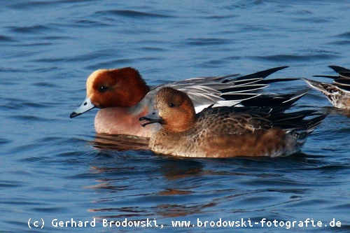 Wie sieht die Pfeifente aus? Zum Aussehen, zur Bestimmung und zur Beschreibung zeige ich Euch einige Bilder von der Pfeifente im Prachtkleid und im Ruhekleid (Schlichtkleid). Im Prachtkleid kann man Weibchen und Männchen bei der Pfeifente im Gefieder gut unterscheiden. Das Männchen ist auch etwas größer und schwerer. Im Ruhekleid (Schlichtkleid) sind die Männchen schnell mit den Weibchen oder mit den Jungvögeln zu verwechseln. Nun zum Aussehen und die Merkmale vom Männchen im Prachtkleid. Das Obergefieder ist grau, Kopf und Hals sind rotbraun, auf der Stirn haben sie einen gelblichen Streifen, der Schnabel ist blaugrau mit schwarzer Spitze, die Brust ist rosa, die Unterseite ist weiß, die Flügel haben ein weißes Flügelfeld/Flügelband und die Beine sind dunkel.