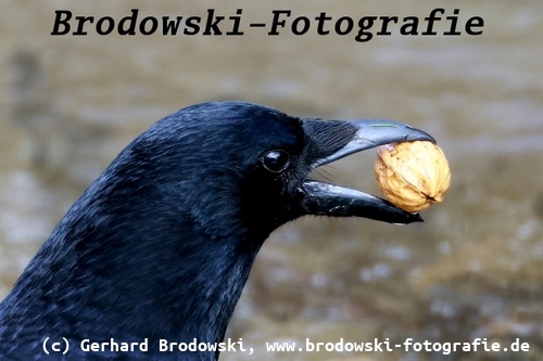 Ich holte mir einige Nüsse vom nahegelegenen Wallnussbaum, um zusehen ob die Rabenkrähen auch die Nüsse aus dem Wasser holen. Ich schmiss eine Wallnuss ins Wasser. Es dauerte nicht lange und zwei Rabenkrähen kamen angeflogen und beobachten wo die Nüsse hinschwammen. Als die Nuss dicht genug am Ufer war kam eine Krähe angeflogen und sprang ins Wasser. Dazu einige Bilder.