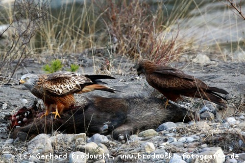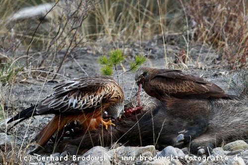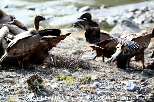 Die Geier sind verschwunden und sofort sind die beiden Milane wieder da und machen sich an den Überresten zu schaffen. Da landet plötzlich ein Schmutzgeier im Flussbett und zwei Raben kommen schreiend angeflogen. Wollen die Raben durch ihr Geschrei die Milane und den Schmutzgeier vertreiben? Der Schmutzgeier verschwand genauso schnell, wie er gekommen war. Die Milane beeindruckte das laute Geschrei nicht und sie fraßen weiter. Jeder bekam etwas ab. Die Raben wurden von den Milanen hin und wieder in die Schranken gewiesen. So verging der Tag sehr schnell.
