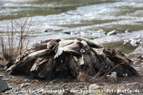 Es dauerte nicht lange und wir hatten die Gruppe Gänsegeier eingeholt. Was ist passiert? Es lagen in einer S-Kurve tote Gänsegeier auf der Straße. Wollten die Artgenossen sie fressen? Nein! Sie hatten es auf zwei Wildschweine abgesehen, die nach einem Unfall mit einem PKW im Straßengraben lagen. Ich hielt auf dem nächsten Parkplatz an, nahm die toten Geier von der Straße und zog die Wildschweine aus dem Straßengraben und legte die Wildschweine nacheinander in einem nahen Flussbett ab. Nun konnten die Geier die Wildschweine fressen und wurden nicht mehr durch heranfahrende Autos gestört. Vom Parkplatz aus behielten wir die Wildschweine im Auge, um beim großen Fressen der Geier dabeizusein. Ihr könnt schon gespannt sein auf meine Seite das Große Geier Fressen. Nun ein paar Bilder zum Vorgeschmack. Aber denkt nicht, dass das alles tote Geier sind die da auf einem Haufen liegen.