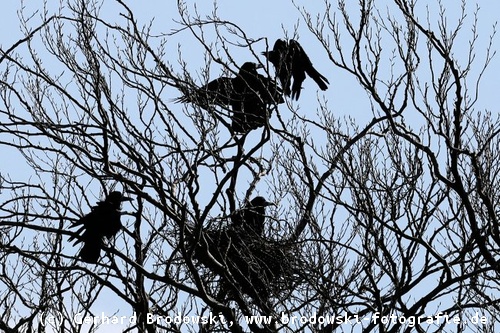 Aber wenn die Besitzer vom Nest eintreffen, dann kommt es zu Auseinandersetzungen. Da fliegen dann auch schon mal einige Federn durch die Luft. Die Brutplätze liegen nicht weit auseinander in der Saatkrähen-Kolonie.