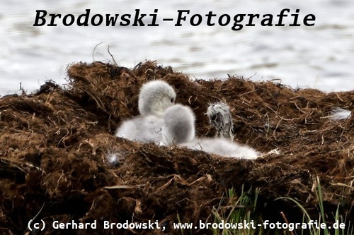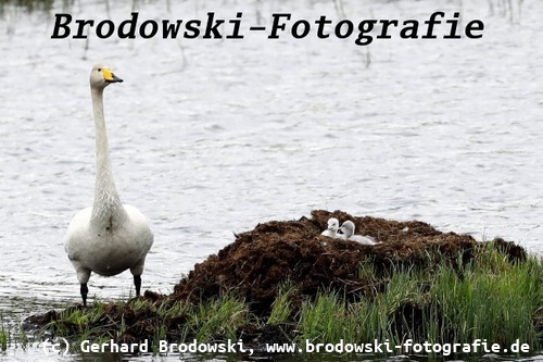 Brutverhalten: Der Singschwan baut sein Nest, wie der Höckerschwan, in Wassernähe aus Pflanzenresten. Das Nest wird mit Daunen ausgepolstert.