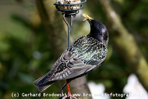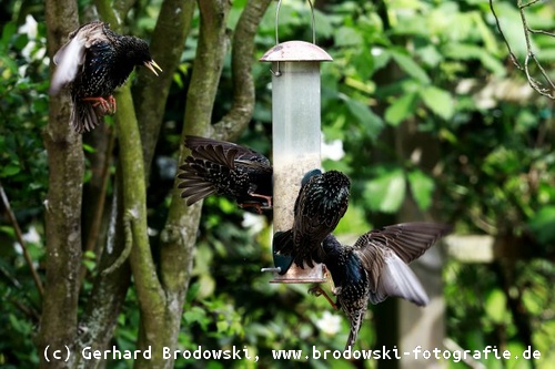 Die Stare haben es schnell gelernt, wie man den Futterspender anfliegen muss. Sie haben zugeschaut wie die Meisen, Finken und der Eichelhäher das machten.