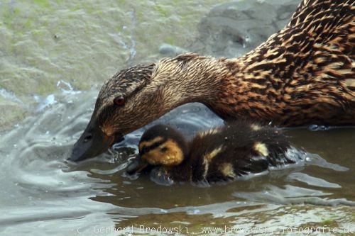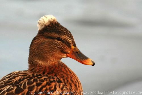 Kurzinfo zu dem Bild Stockente mit Kopfschmuck. Der Kopfschmuck entsteht während der Paarung. Die Erpel halten sich dann am Gefieder des Kopfes der Weibchen fest und so entsteht der Kopfschmuck. Weitere Infos unter Enten-Info.