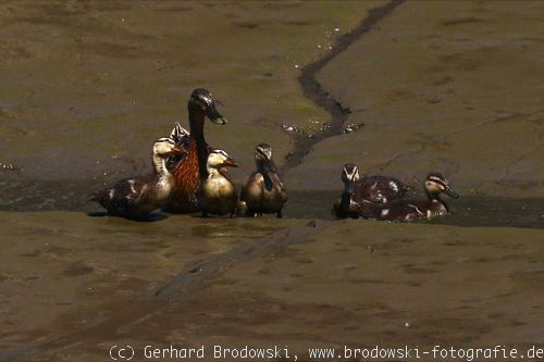Ich weiß es nicht. Aber ich werde es weiter beobachten. Die nächsten Tage kann ich wieder nur eines beobachten- sie sitzt und sitzt und sitzt. Am 17. Juni ist das Nest leer. Unter dem Nest im Kanal laufen junge Stockenten mit ihrer Mutter im Schlick herum und suchen nach Nahrung. Ich war enttäuscht. Ich wollte doch das Springen der jungen Stockenten mitbekommen. Und nun waren sie schon unten im Kanal gelandet.