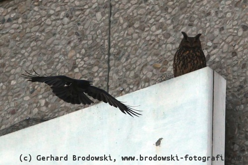 Ich hätte gerne gewusst, was die beiden sich unterhalten. Will das Uhu Weibchen von ihrem Mann wissen wo er so lange gesteckt hat, oder soll er die Transportkiste verlassen. Ich weiß es nicht. Jeder kann sich anhand der Bilder seine eigenen Gedanken machen. Das Uhu Weibchen flog hin und her und rief ihm dabei zu. Zwischendurch setzte sie sich auch auf den Deckel der Kiste.