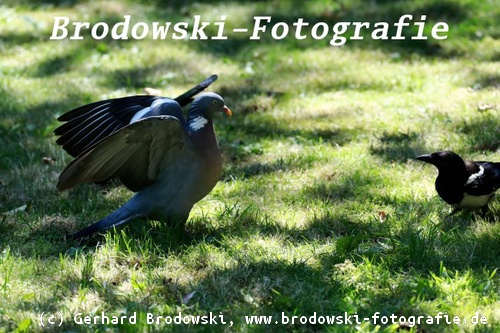Die Elster unterhält sich nicht nur mit anderen Rabenvögeln, sondern auch mit Tauben, wie Ihr auf dem nächsten Bild sehen könnt.
