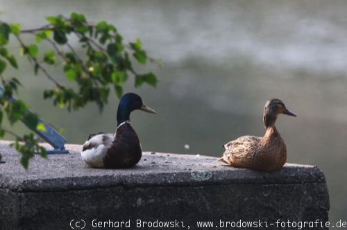 Die Stockente bleibt eine ganze Weile im Kanal sitzen und lässt den Wanderfalken nicht aus dem Auge. Anschließend fliegt sie zur gegenüberliegende Kaimauer und trifft sich mit ihrem Männchen. Sie putzt erstmal ihr Gefieder. Und nun beobachten beide Stockenten die Falken an ihrem Nest. Dass die Ente den Angriff so gut überstanden hat hätte ich nicht gedacht. Bis Sonnenuntergang hat die Stockente ihren Brutplatz nicht aufgesucht. Ich war schon auf den nächsten Tag gespannt, ob sie wieder auf ihrem Nest sitzt und weiter brütet. Denn all zulange wird es nicht mehr dauern und die Küken schlüpfen.