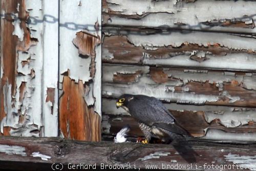 Das Wanderfalken Männchen besuchte die Stockente während der Brutzeit acht mal, und jedes mal blieb die Stockente sitzen. Mann braucht sich ja nur das Größenverhältnis ansehen. Wie soll das Wanderfalken Männchen die Stockente bezwingen? Im Stillen denke ich, was wohl passieren würde, wenn das Wanderfalken Weibchen der Stockente einen Besuch abstattet. Es vergehen Tage. Und dann passiert es. Das Wanderfalken Weibchen fliegt zielstrebig zur Stockente. Was hat sie vor? Ihr werdet es gleich zusehen bekommen. Das Falken Weibchen landet auf der Schwelle und die Stockente zögert nicht lange und stößt den Falken rückwärts von der Schwelle. Der Wanderfalke (Falco peregrinus) ist außer sich und greift erneut an. Nun erst mal die passenden Bilder dazu.