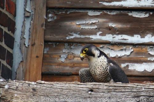 Und nun ist es so weit. Der große Tag steht vor der Tür. Heute sollen die jungen Wanderfalken ausfliegen. Sie haben schon seit zwei Tagen weniger zu fressen bekommen und heute morgen kam das Weibchen ohne Nahrung zum Brutplatz. Und was sehe ich da? Die jungen Wanderfalken zupfen am Gefieder ihrer Mutter, wie die jungen Uhus, wenn sie Hunger haben. Sie fliegt wieder ab, lässt sich ein paar Luken weiter am altem Lagerhaus nieder, und fängt an zu rufen. Das Männchen sitzt gegenüber vom Nest auf seinem Ansitz mit einem Singvogel (Blaumeise) im Fang, und ruft ebenfalls. Wollen sie ihre Jungen aus dem Nest locken? Warten wir es ab.