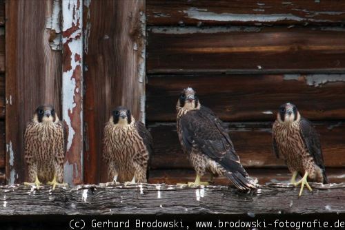Wenn die jungen Wanderfalken über drei Wochen alt sind, verändert sich ihr Gefieder sehr schnell. Sie sehen jeden Tag anders aus. Die jungen Falken sind, wenn sie nicht gerade gefüttert werden, Flugübungen machen oder schlafen, ständig mit ihrer Gefiederpflege beschäftigt. Man staunt jeden Tag vom Neuen, wie schnell sich ihr Gefieder verändert. Wenn die Jungen vier Wochen alt sind, kann man schon durch ihre Größe erkennen ob es sich um Männchen oder Weibchen handelt. Die jungen Falken werden jetzt nur noch zweimal am Tag von beiden Eltern gefüttert. Einmal früh morgens und einmal am späten Abend. Sie fressen aber zwischendurch selbständig von der Beute die die Eltern im Nest zurück lassen.