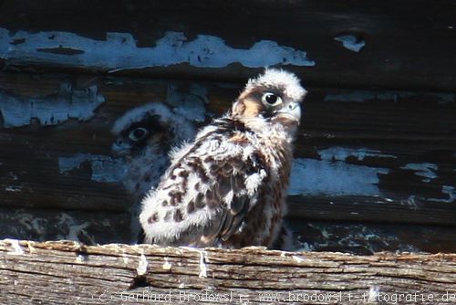 Ich konnte in den ersten Tagen die jungen Falken nicht sehen, denn der Brutplatz lag hinter einem Balken an einem alten Lagerhaus im Hamburger Hafen, in ca. 80 m Entfernung. Die Altvögel kümmern sich vom ersten Tag an sehr fürsorglich um ihren Nachwuchs. Als dass erste Falken Küken geschlüpft war, kam auch das Männchen ans Nest um sich seinen Nachwuchs anzuschauen. Das Weibchen blieb die ersten Tagen alleine am Nest und kümmerte sich um die Küken. Nach drei Tagen fütterte und wärmte (hudert) auch das Männchen.