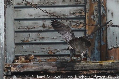 Der Falke besucht auch häufig eine Stockente an ihrem Brutplatz. Mehr dazu unter Wanderfalke bei der Jagd und Wanderfalke und Stockente.