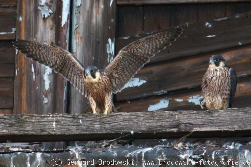 Da war es schon passiert. Beide Jungvögel haben den Brutplatz gemeinsam verlassen und sind in der Luft. Wird die erste Landung auch klappen? Der eine Falke landet sicher auf dem Dach vom Lagerschuppen und der andere fliegt über den Kanal und landet dort sicher auf einem Dach. Ich hätte nicht gedacht, dass die beiden jungen Wanderfalken schon so sicher fliegen. Es war kaum ein Unterschied zum Altvogel zu sehen. Da sieht man wie wichtig es für Falken ist eine Nisthilfe (Brutplatz) zu haben, in der die Jungen richtig rumspringen können, und nicht gleich runter fallen bevor sie richtig fliegen können. Somit vermeidet man, dass junge Falken in Auffangstationen landen und später wieder ausgewildert werden müssen.