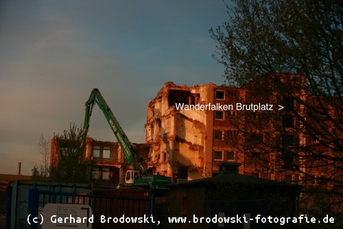 Am ersten April war ich wieder im Lande und kontrollierte sofort den Falken Brutplatz. Ich traute meinen Augen nicht. Die Wanderfalken hatten mit ihrem Brutgeschäft begonnen, und die Abrissbagger waren keine 20m vom Brutplatz entfernt.