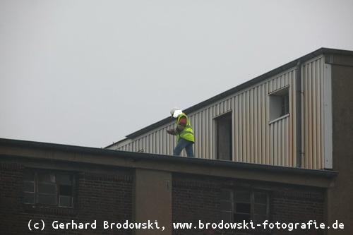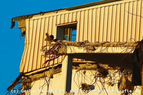 Ich rief sofort die Umweltpolizei und sorgte dafür, dass die Baustelle von HPA bis auf weiteres stillgelegt wird. In der Zwischenzeit, bis der Beamte von der Umweltpolizei vor Ort erschien, machte ich die Abrissfirma darauf aufmerksam, dass am Gebäude ein streng geschützter Vogel brütet. Ein Mitarbeiter der Abrissfirma versicherte mir das könne nicht sein, er kontrolliere jeden Morgen das Gebäude. Er wollte nun von mir den Standort vom Brutplatz wissen, den ich ihm ungefähr angab. Nach dieser Information musste ich das Grundstück verlassen und hinter mir wurde das Tor zugeschoben. Der Mitarbeiter ging zielstrebig ins Gebäude. Was hatte er vor? Ich fuhr schnell zur anderen Seite, denn von dort sehe ich den Brutplatz.