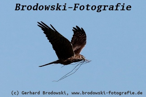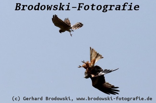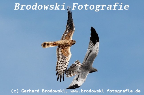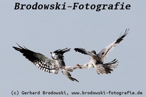 Und nun kann das Männchen zeigen, was er dem Weibchen bei der Balz versprochen hat. Dass er fit genug ist während der Brutsaison gen Himmel aufzusteigen, um Eindringlinge wie z.B. Rohrweihen, Rabenvögel, Schwarzmilane, Zwergadler, Rotmilane, Mäusebussard und Schlangenadler anzugreifen, um diese vom Brutplatz fern zu halten. Sollte er das mal nicht alleine schaffen, wird er von anderen Männchen aus dem Nachbarrevier unterstützt. Dazu einige Bilder.