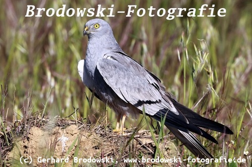 Wie sieht das Männchen aus? Das Obergefieder, der Kopf und die Brust sind grau bis blaugrau, je nach Sonneneinwirkung. Die Augen sind gelb, die Schnabelspitze ist schwarz, sie haben schwarze Flügelspitzen und oben auf den Flügeln einen schwarzen Strich, einen weißen Bürzel und die langen Schwanzfedern sind schwarz gebändert. Die Unterseite und die Flanken sind gestrichelt. Die langen dünnen Beine sind gelb. Nun ein paar Bilder zum Erkennen und zum Bestimmen vom Wiesenweihen Männchen.