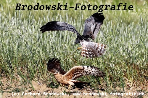 Die Weibchen der Wiesenweihe helfen auch bei der Revierverteidigung mit. Ich konnte beobachten wie ein Weibchen einen Rotmilan angriff. Hin und wieder kommt es bei Angriffen zur Todesspirale. Mehr über die Todesspirale unter: