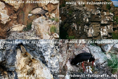 Unterschied Felsen Brutplätze: Im Gebirge und an Felswänden an der Küste gibt es auch viele Felsenbrüter in Felsnischen. Felsbrüter sind die Vogelarten die ihre Nester/Horste auf z.B. Felsvorsprüngen oder in kleinen Höhlen auf dem Boden bauen. Wer gehört zu den Felsbrütern? Zu den bekanntesten gehören die Dreizehenöwe, die Silbermöwe, die Gänsegeier, die Steinadler, der Turmfalke, die Alpendohle, die Felsenschwalbe, der Uhu, die Trottellumme, der Wanderfalke, der Schwarzstorch, der Kolkrabe, die Blaumerle, der Gerfalke, der Basstölpel und sogar der Weißstorch.